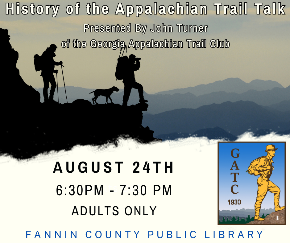 A big thank you to the Fannin County Library for hosting me Aug. 24 for a presentation on the history of the Appalachian Trail, a quick look at my section hike and some information about the Georgia Appalachian Trail Club. My presentation was attended by 42 people and they had great questions about the trail, my hike, food safety and other trail stuff.